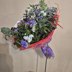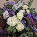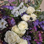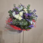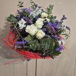 Un bouquet en forma de nido floral que transmite naturalidad y delicadeza. La base, elaborada con fibras rojas entrelazadas, envuelve la composición como un refugio orgánico donde brotan rosas blancas de gran elegancia, acompañadas de flores de temporada en tonos malva, violeta y blanco. El eucalipto, las pequeñas bayas y los verdes frescos aportan textura y movimiento, creando un equilibrio entre lo silvestre y lo sofisticado. Un diseño con aire primaveral, ligero y lleno de vida, ideal para sorprender con un detalle diferente: un bouquet que parece nacido de la naturaleza, con el sello creativo de Flors Mas Lluhi.