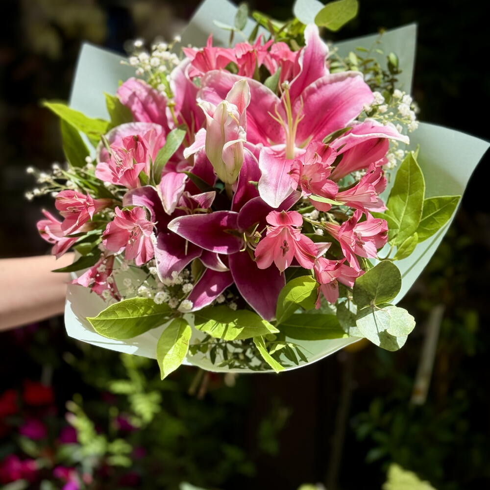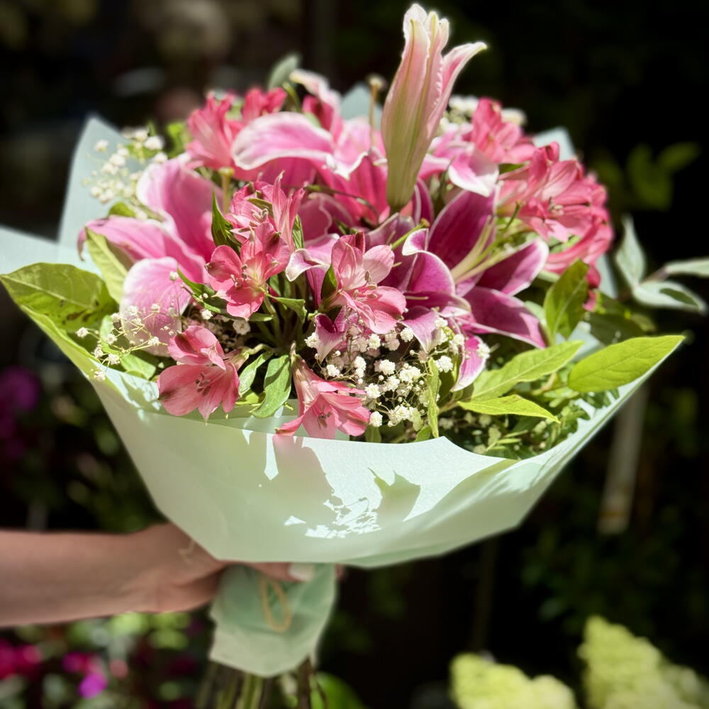 Descubre la elegancia atemporal con este ramo clásico, compuesto por un impresionante arreglo de 5 uds. de verde decorativo, 2 uds. de encantadora gypsophila blanca, 2 uds. de lirios orientales rosados magníficos y 3 uds. de magnífica alstroemeria rosada. Cada flor ha sido cuidadosamente seleccionada y dispuesta para capturar la belleza y la sencillez de la naturaleza, proporcionando un toque de sofisticación a cualquier ambiente. Este ramo es la forma perfecta de transmitir sentimientos de amor, gratitud y alegría en cualquier ocasión.