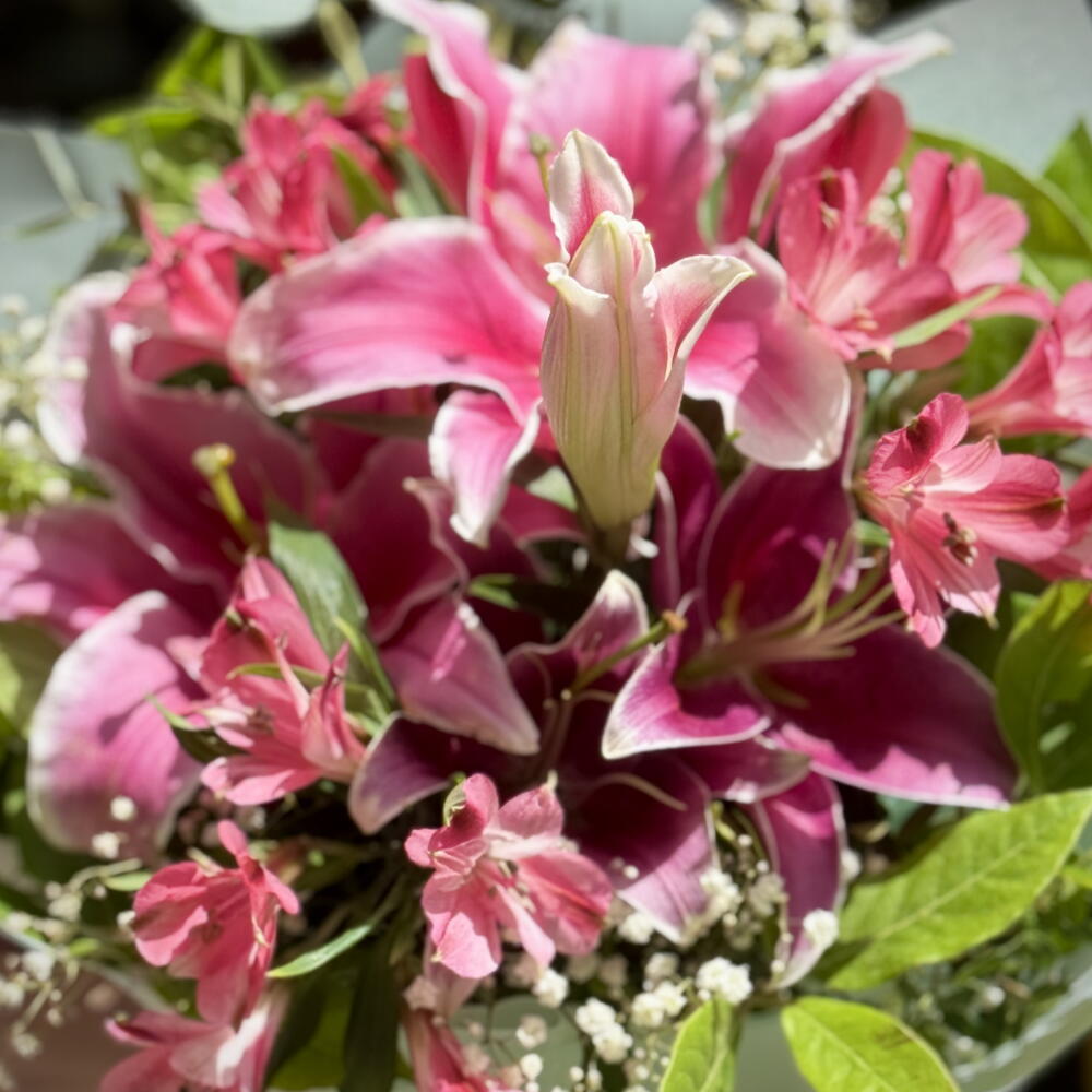 verde decorativo - 5 ud. gypsophila blanca - 2 ud. lirios orientales rosados - 2 ud. alstroemeria rosada - 3 ud.