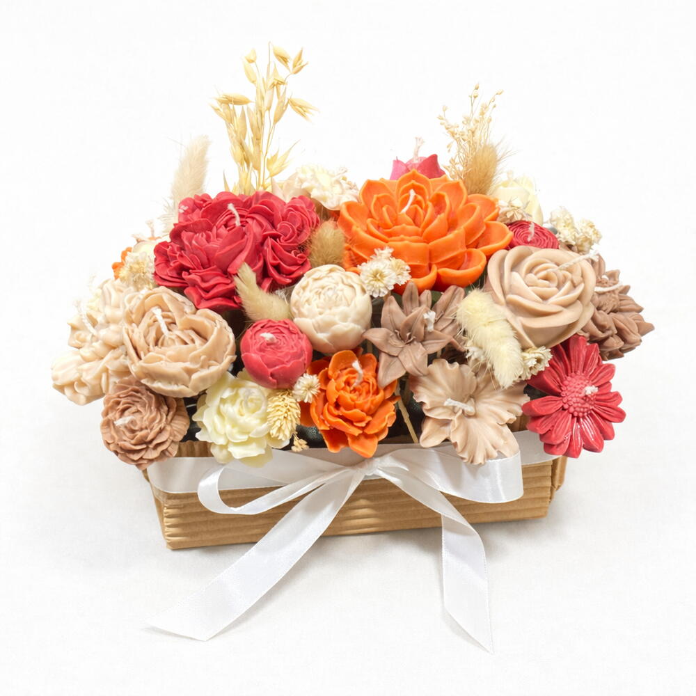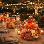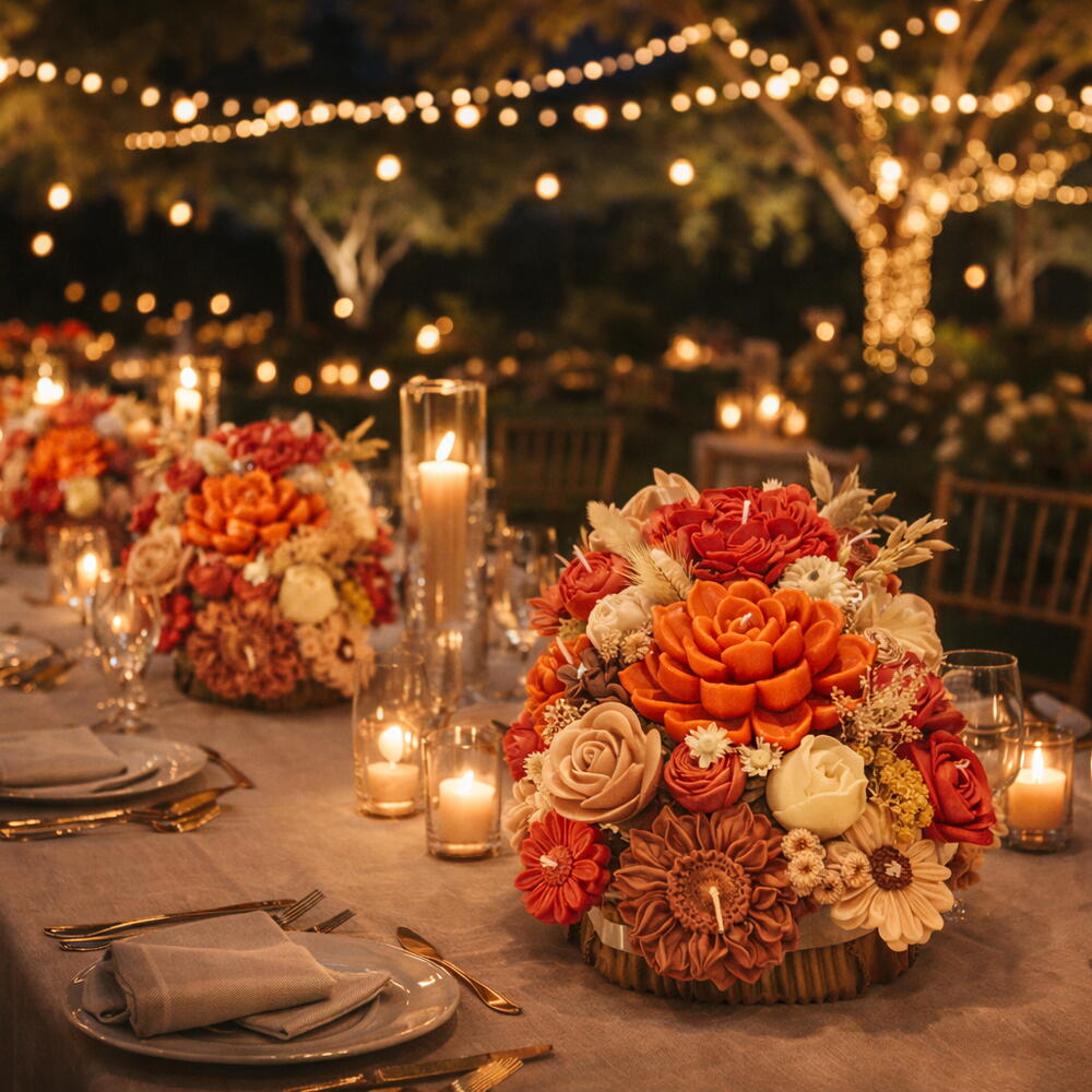 Una composición intensa y sofisticada en tonos terracota, coral quemado y nude tostado. Ember Élégance Couture redefine el romanticismo nupcial con carácter, calidez y presencia. Un centro de mesa diseñado para bodas con personalidad y estética contemporánea.