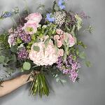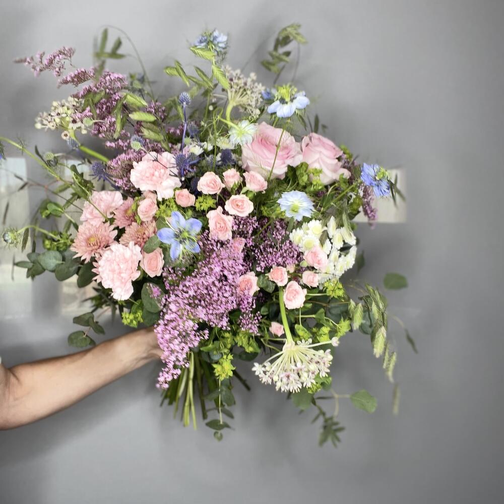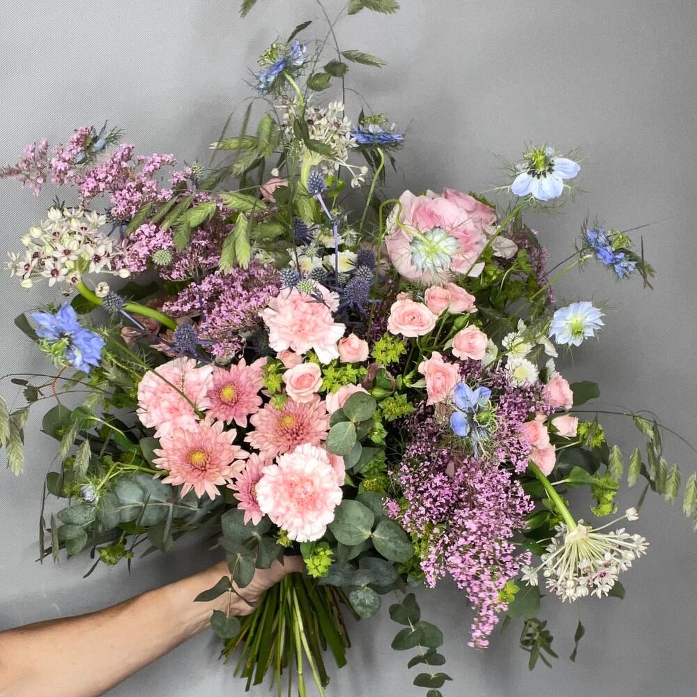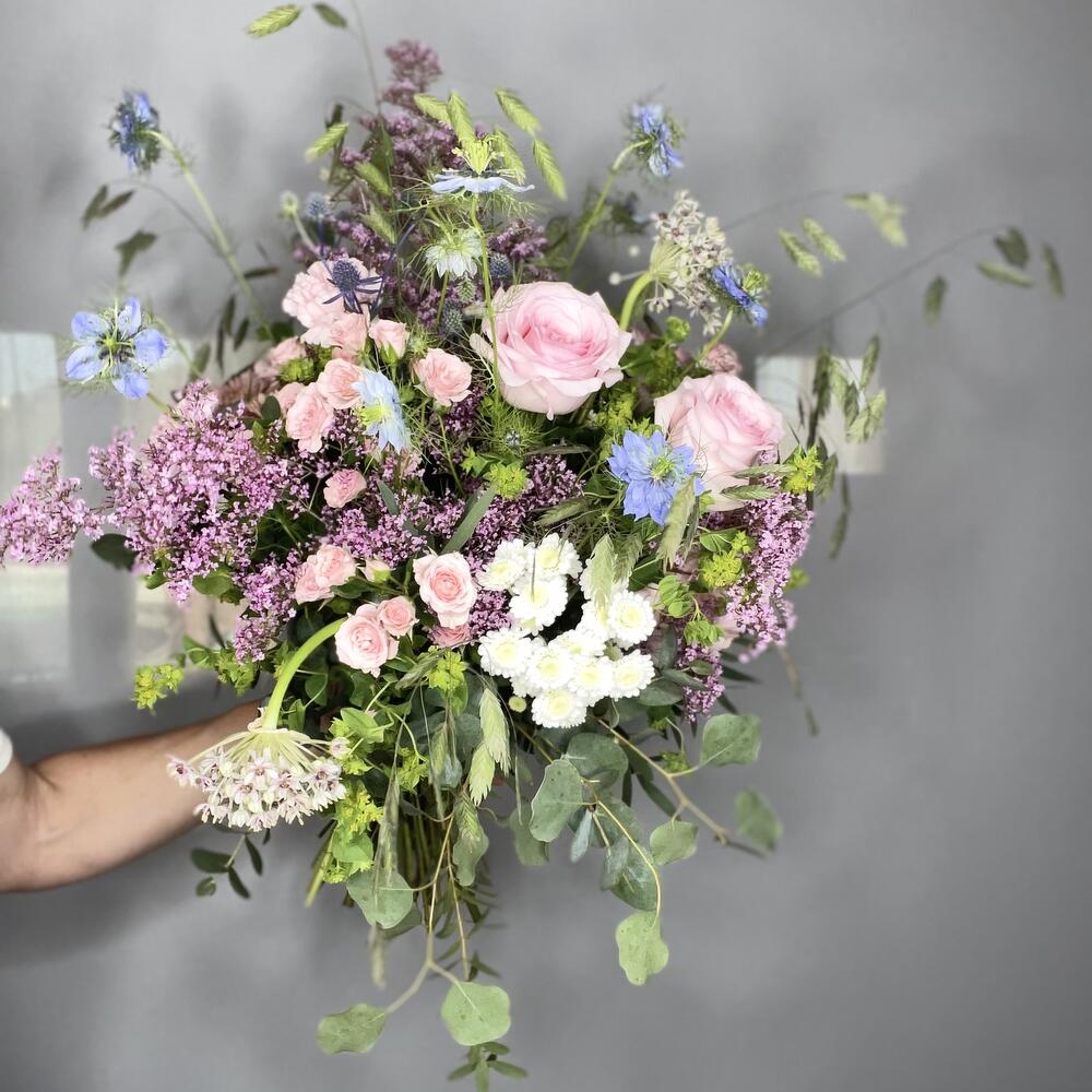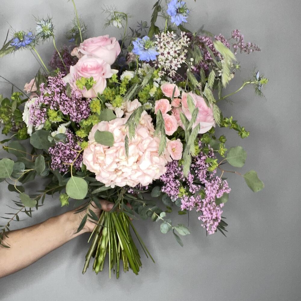 hortensia - 1 ud. eucalipto cinerea - 10 ud. claveles rosados - 5 ud. rosa nina ecuador - 5 ud. rosa ramificada lidya - 3 ud. margarita caliento pink - 3 ud. nigel’s azul - 7 ud. achilea park - 5 ud. chasmantiun - 7 ud.
