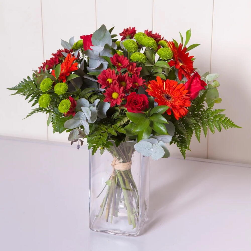 rosa roja - 2 ud. Gerbera roja - 3 ud. verdes de temporada - 1 ud. margarita roja - 3 ud. margarita feeling green - 3 ud.