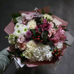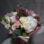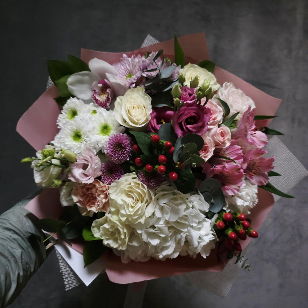 Alstroemeria - 1 ud. hortensia - 1 ud. Lisianthus - 2 ud. chrysanthemum bush - 3 ud. eucalipto - 2 ud. rosa - 5 ud. clavel - 4 ud. hipérico - 2 ud. rosa petiminí - 1 ud.