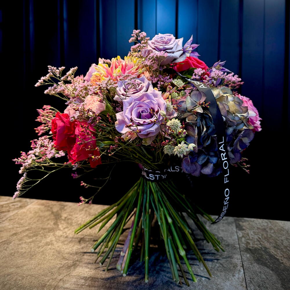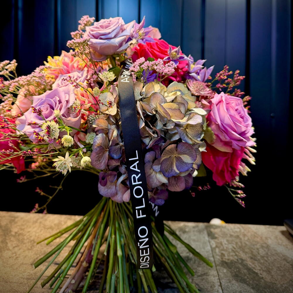 Este bouquet exclusivo combina rosas en tonos rosados y fucsia con hortensia en delicados matices malva, creando una composición elegante y sofisticada. Cada flor ha sido seleccionada cuidadosamente para transmitir sensibilidad, lujo y armonía. Un diseño floral de autor, perfecto para sorprender en momentos especiales y dejar una impresión inolvidable.