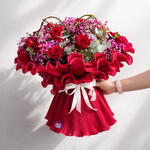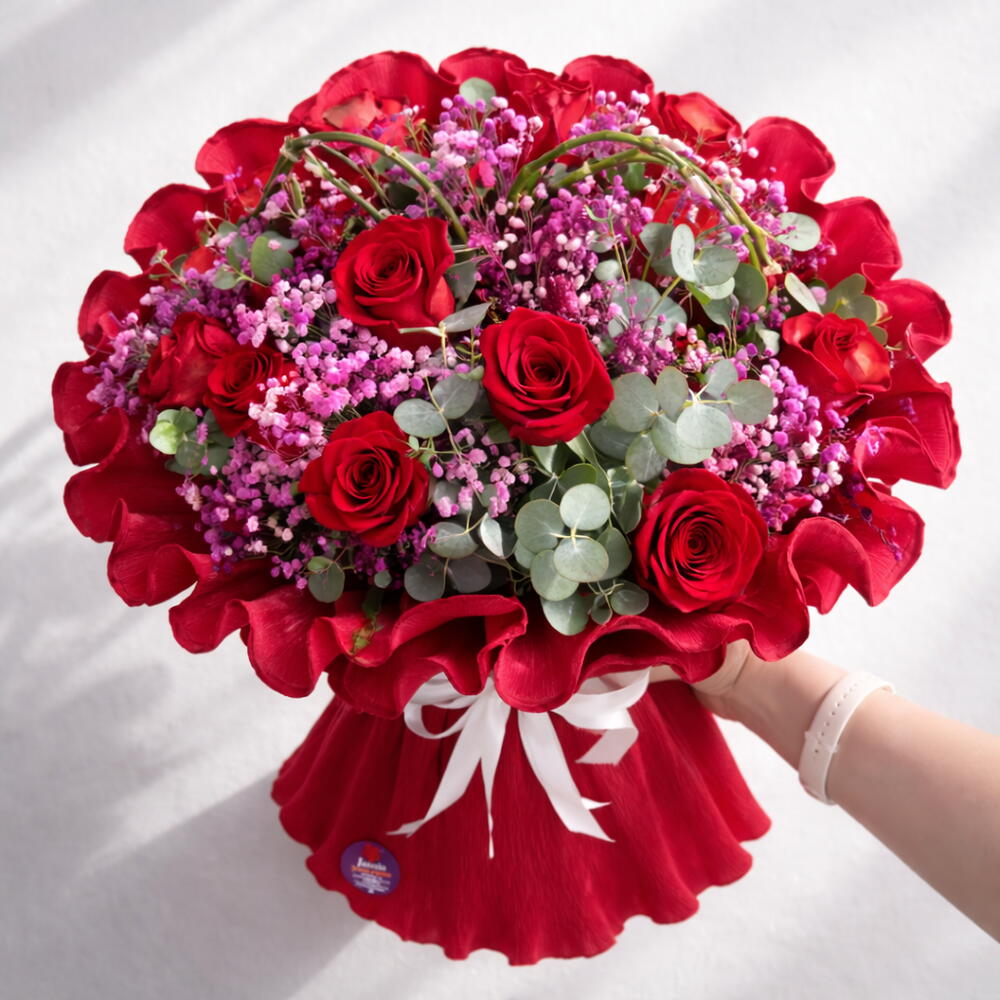 Gypsophila - 5 ud. eucalipto - 7 ud. rosas rojas - 15 ud.