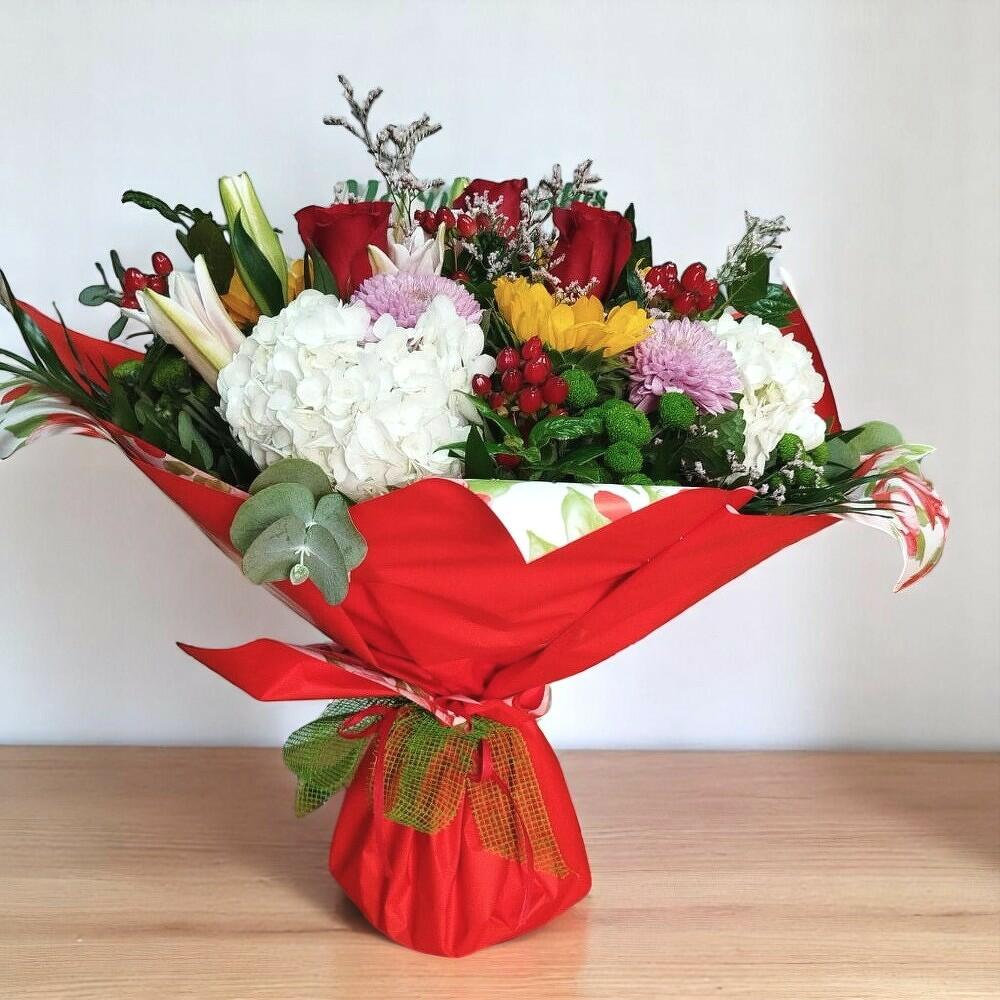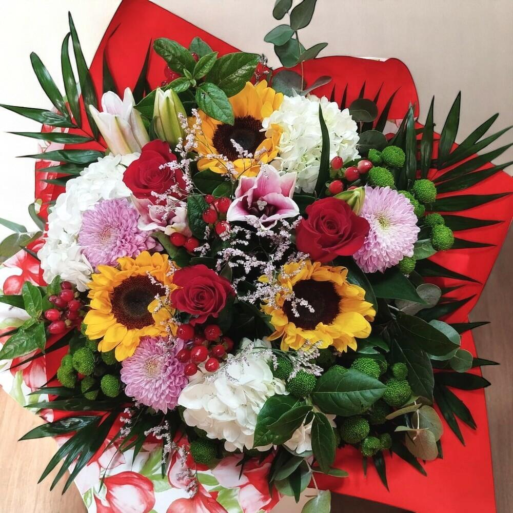 Un ramo vibrante, alegre y lleno de vida, perfecto para celebrar momentos especiales con color y frescura. Esta exquisita composición mezcla flores de diferentes formas y tonalidades: desde la intensidad de las rosas rojas hasta la suavidad de los lirios, la textura de las hortensias y el brillo de los girasoles. Las bayas rojas y los verdes ornamentales complementan el conjunto con un estilo festivo y natural. Ideal para cumpleaños, felicitaciones o simplemente para sorprender con un detalle inolvidable. Cambia el agua del florero cada dos días y corta los tallos en diagonal para mantener las flores frescas. Coloca el ramo en un lugar fresco, lejos de la luz solar directa y del calor. Retira las flores marchitas a medida que lo necesiten y, si puedes, añade conservante floral al agua.