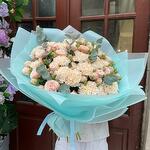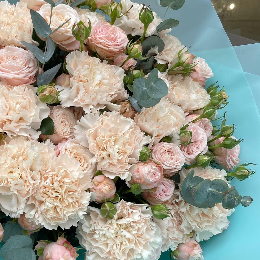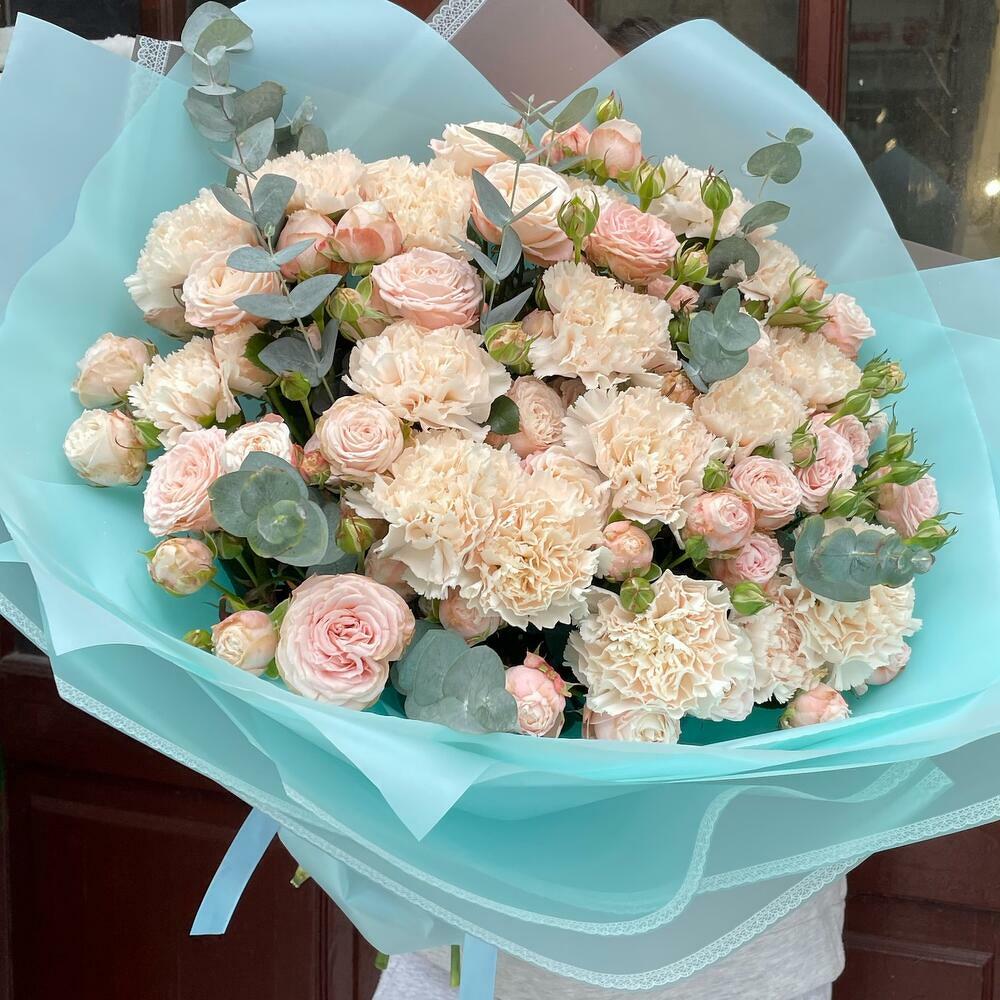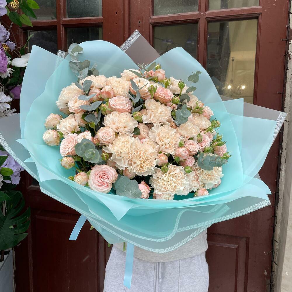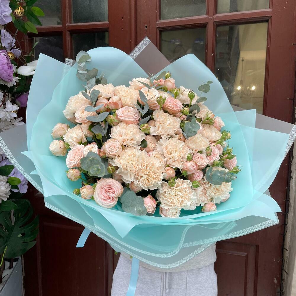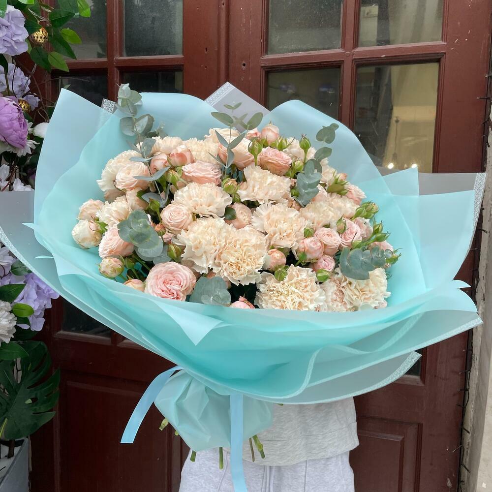Eucalyptus - 5 ud. Spray rose - 9 ud. dianthus - 17 ud. designer wrapping - 3 ud.