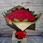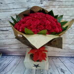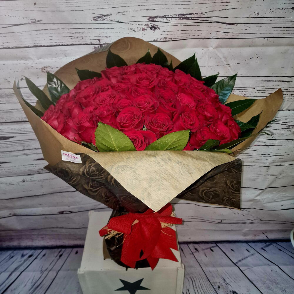 rosas rojas - 70 ud. lazo decorativo - 1 ud. hojas verdes - 6 ud. papel decorativo - 1 ud.