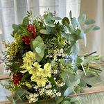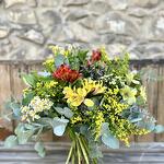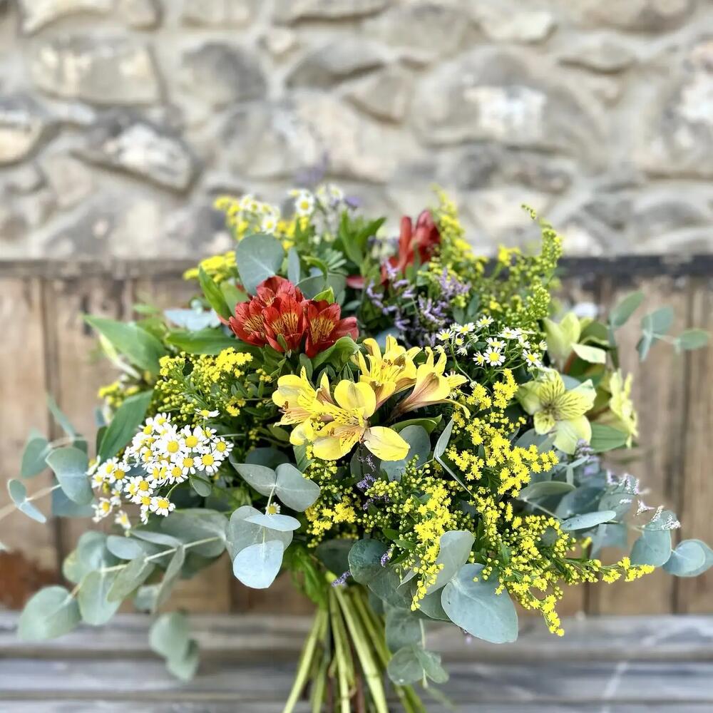 tallos de eucalipto - 12 ud. tallos de solidago - 5 ud. tallos de alstroemerias amarillas - 2 ud. tallos de alstroemerias rojas - 2 ud. tallos de alstroemerias verdes - 2 ud.