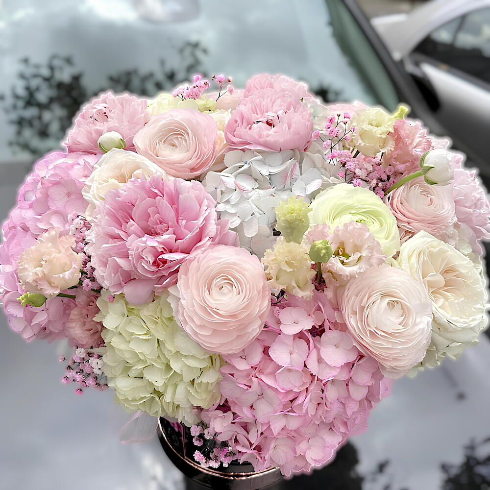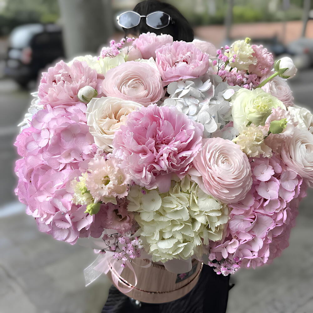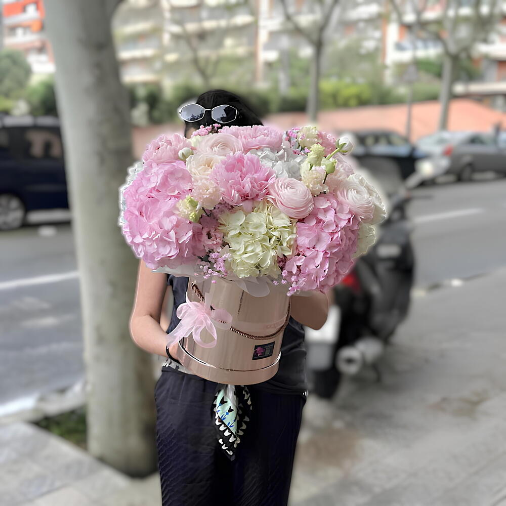 Hortensia - 7 ud. Rosa Ecuador - 5 ud. Caja - 1 ud. los verdes decorativos - 10 ud. rosas arbustivas - 5 ud.