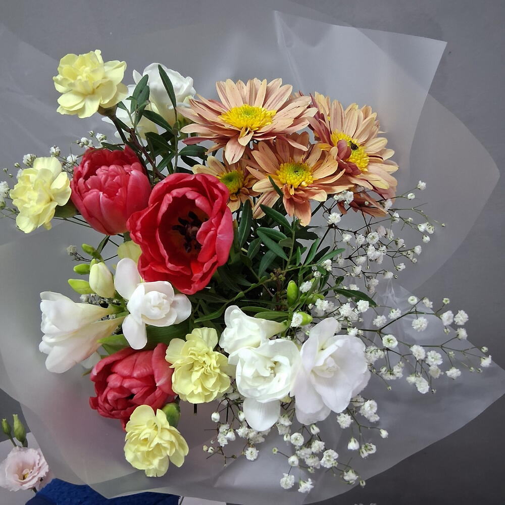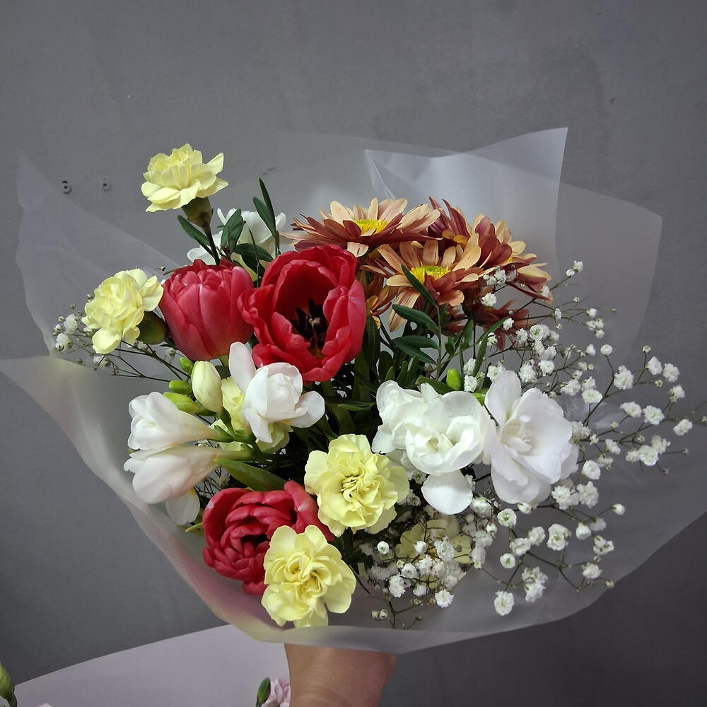 tulipanes - 3 ud. crisantemo - 1 ud. verdes variados - 3 ud. paniculata blanca - 1 ud. clavel columbiano - 2 ud. fresia blanca - 3 ud. cinta decorativa - 1 ud. papel decorativo - 2 ud.
