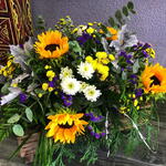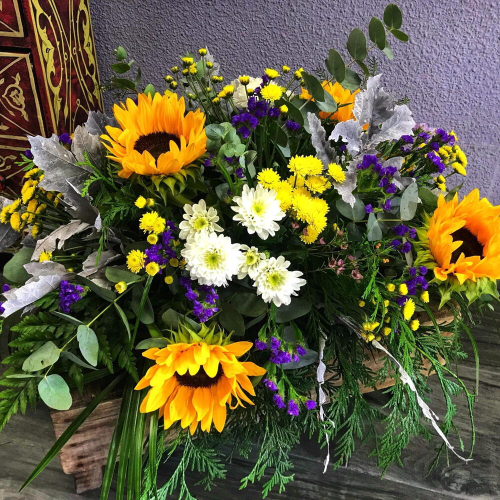 eucalipto - 2 ud. girasoles - 4 ud. roble decorativo plateado - 2 ud. crisantemos blancos tallos - 2 ud. crisantemos amarillos tallos - 3 ud. tuya verde - 2 ud.