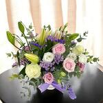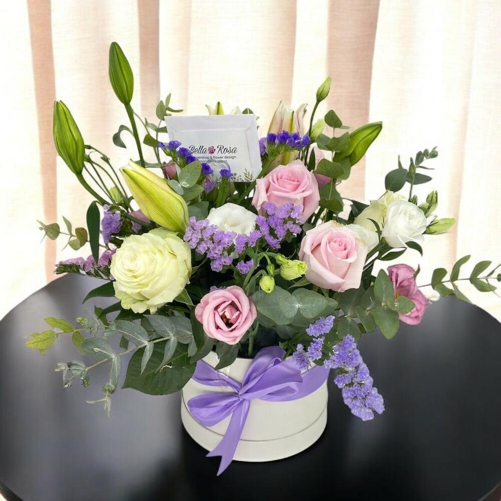 rosa blanca - 2 ud. rosa rosada - 2 ud. liliums blanco - 2 ud. lisianthus rosa - 3 ud. limonium malva - 3 ud.