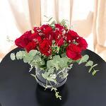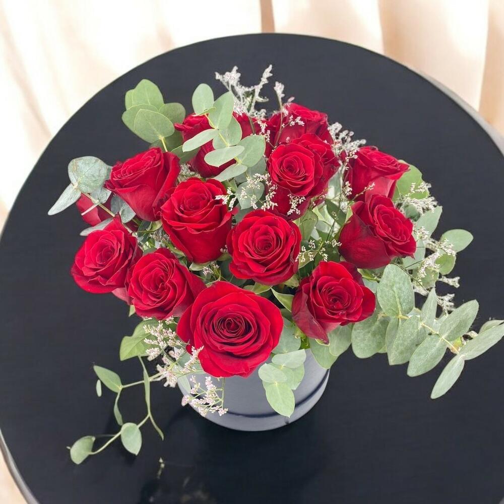Un sofisticado arreglo de rosas rojas vibrantes, cuidadosamente dispuesto en una elegante caja negra. El diseño se complementa con la frescura del eucalipto y delicadas flores blancas, creando un contraste encantador y moderno. Perfecto para ocasiones especiales como aniversarios, celebraciones o para expresar sentimientos profundos de amor y admiración. Su presentación minimalista y refinada lo convierte en un regalo lleno de estilo y significado.