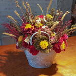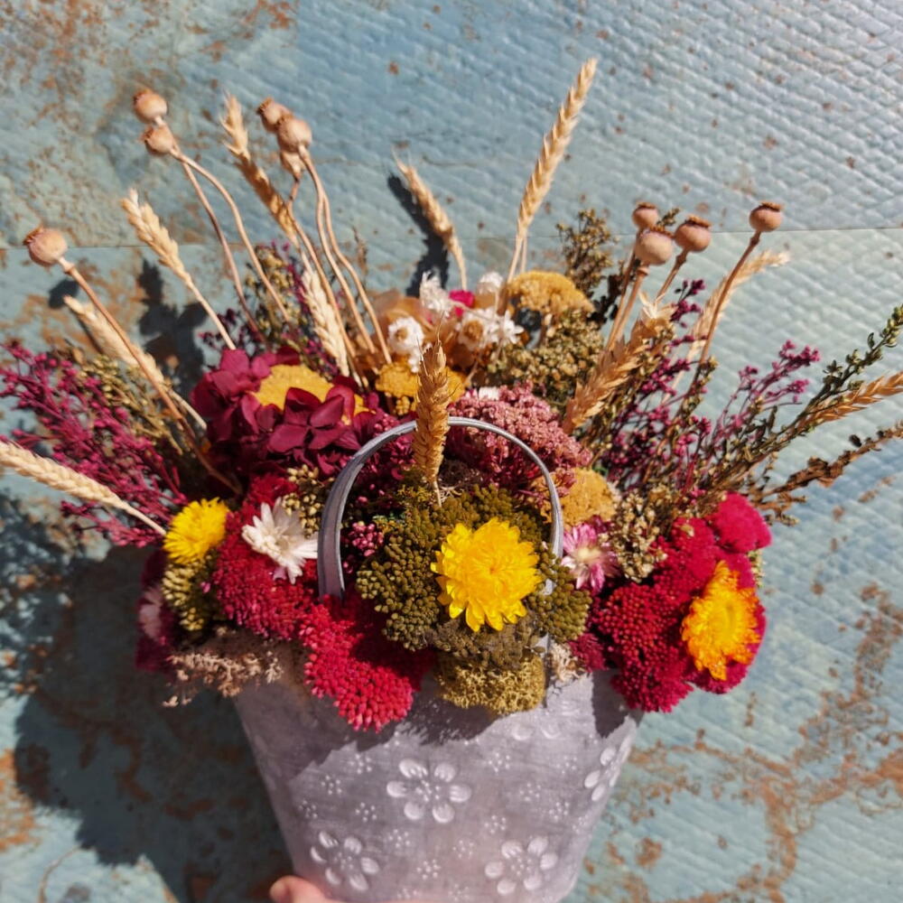 Un arreglo lleno de calidez, textura y encanto rústico. Este precioso cesto metálico decorado con flores secas combina tonos vibrantes de rojo, amarillo, burdeos y dorado, evocando los colores del otoño. Las espigas y semillas añaden un toque campestre que transmite armonía y naturalidad. Cada flor ha sido cuidadosamente preservada para mantener su belleza y frescura por mucho tiempo. Perfecto para decorar mesas, estanterías o rincones especiales con un aire acogedor. Una pieza artesanal que celebra la belleza de la naturaleza en su forma más pura y duradera.