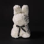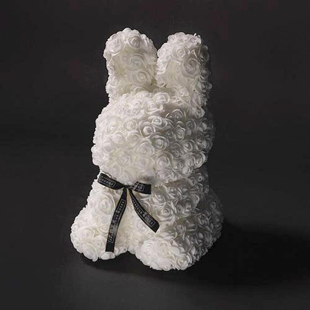 Este adorable conejito de flores blancas es el detalle perfecto para expresar amor y ternura de una manera única. Hecho completamente de delicadas rosas blancas, cada flor ha sido cuidadosamente colocada para crear una figura encantadora y elegante. El lazo negro en el centro agrega un toque de sofisticación, haciendo que este regalo sea aún más especial. Ideal para San Valentín, aniversarios o cualquier ocasión que requiera un gesto romántico, este conejito es perfecto para sorprender a esa persona especial. Además, su diseño encantador y su suavidad lo convierten en una pieza decorativa ideal para cualquier espacio. Un regalo que simboliza amor puro y ternura, perfecto para iluminar el día de quien lo reciba. ¡Haz que ese momento sea inolvidable con este adorable conejito de flores!