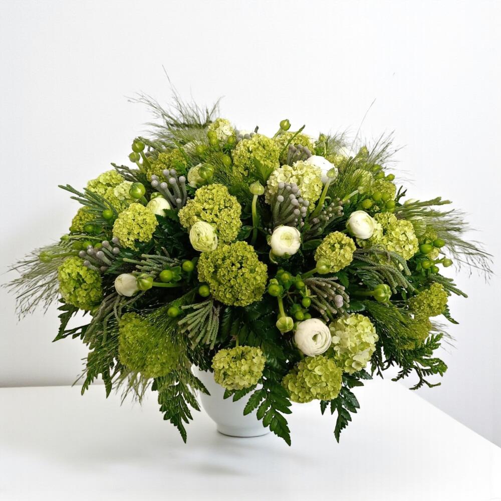 Frescor Romantico – Composicion floral elegante en tonos verdes y blancos