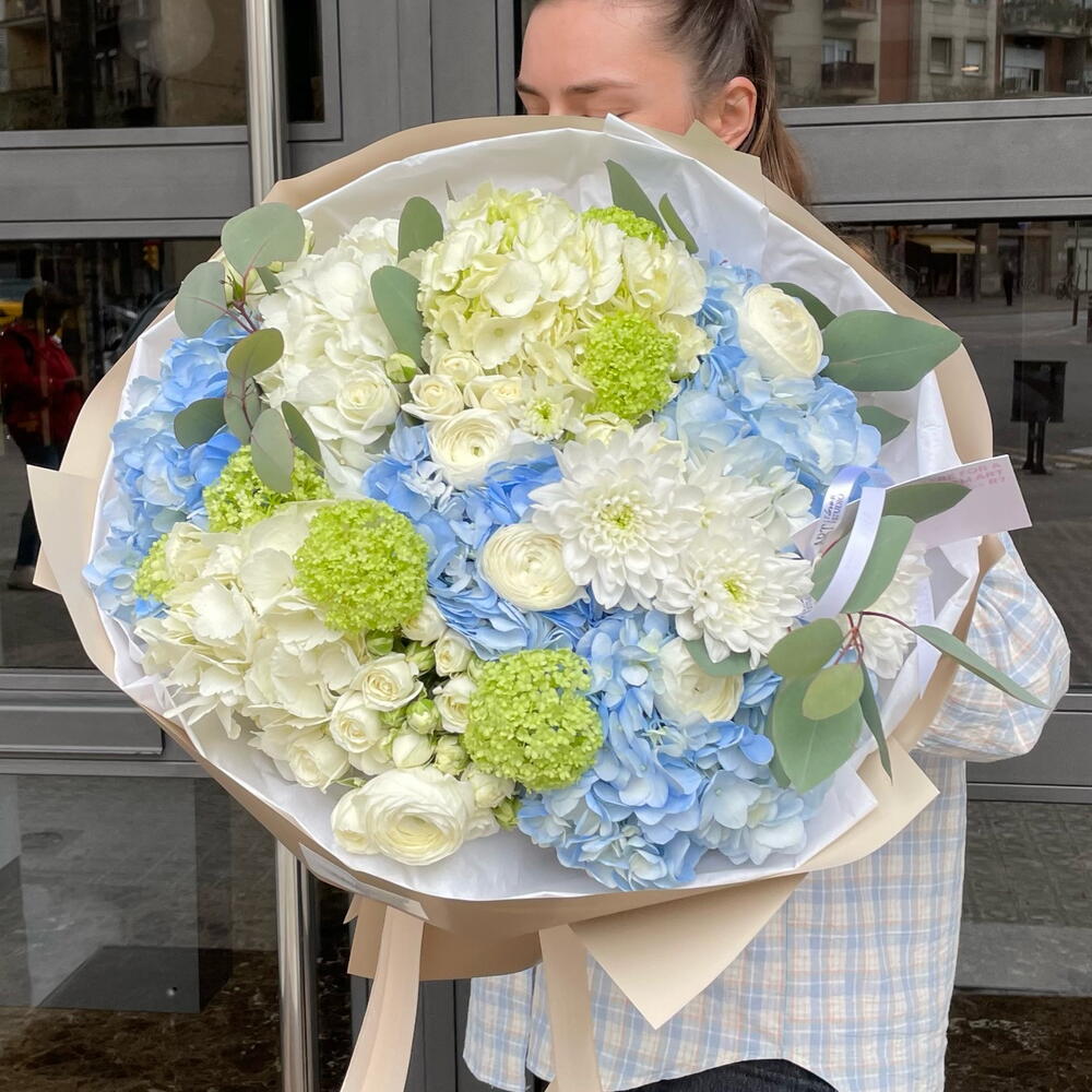 Eucalyptus - 1 ud. Hydrangea - 4 ud. El crisantemo - 1 ud. Viburnum - 3 ud. ranunculus - 5 ud. flor de rosa spray blanca - 5 ud.