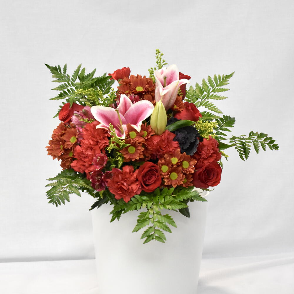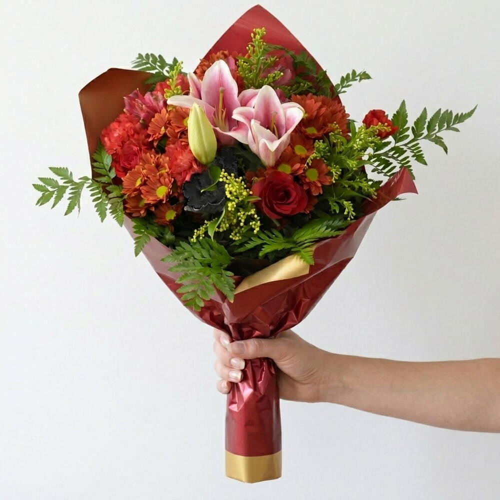 rosas rojas - 4 ud. lilium rosa - 1 ud. astromelias rojas - 4 ud. claveles rojos - 4 ud. margaritas rojas - 3 ud.