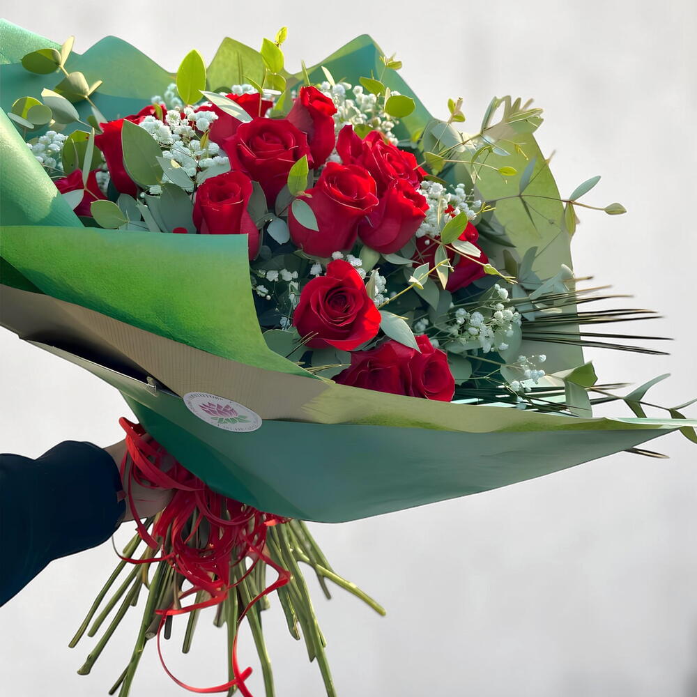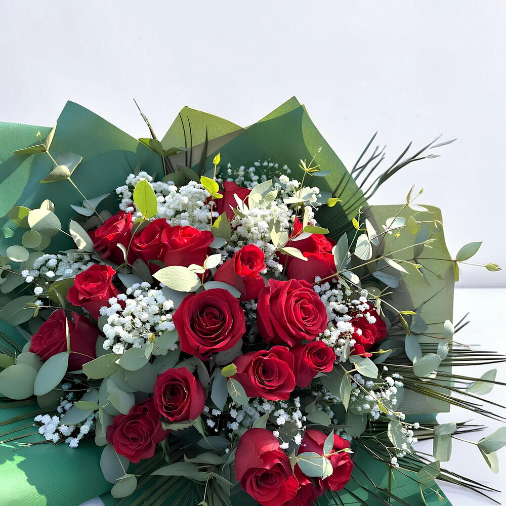 Este es un hermoso arreglo que consta de 24 radiantes rosas rojas que simbolizan pasión y amor. Añadimos delicadas paniculatas blancas que resaltan la belleza de las rosas y distintos tipos de verdes que aportan frescura y naturalidad al conjunto. El arreglo está bellamente envuelto en hojas de papel kraft verde para un acabado elegante y eco-amigable. Este ramo clásico es perfecto para expresar tus sentimientos más profundos, ya sea amor, respeto o amistad.