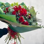 rosas rojas - 25 ud. paniculata blanca - 5 ud. verdes varios - 10 ud. papel kraft verde - 4 ud.