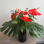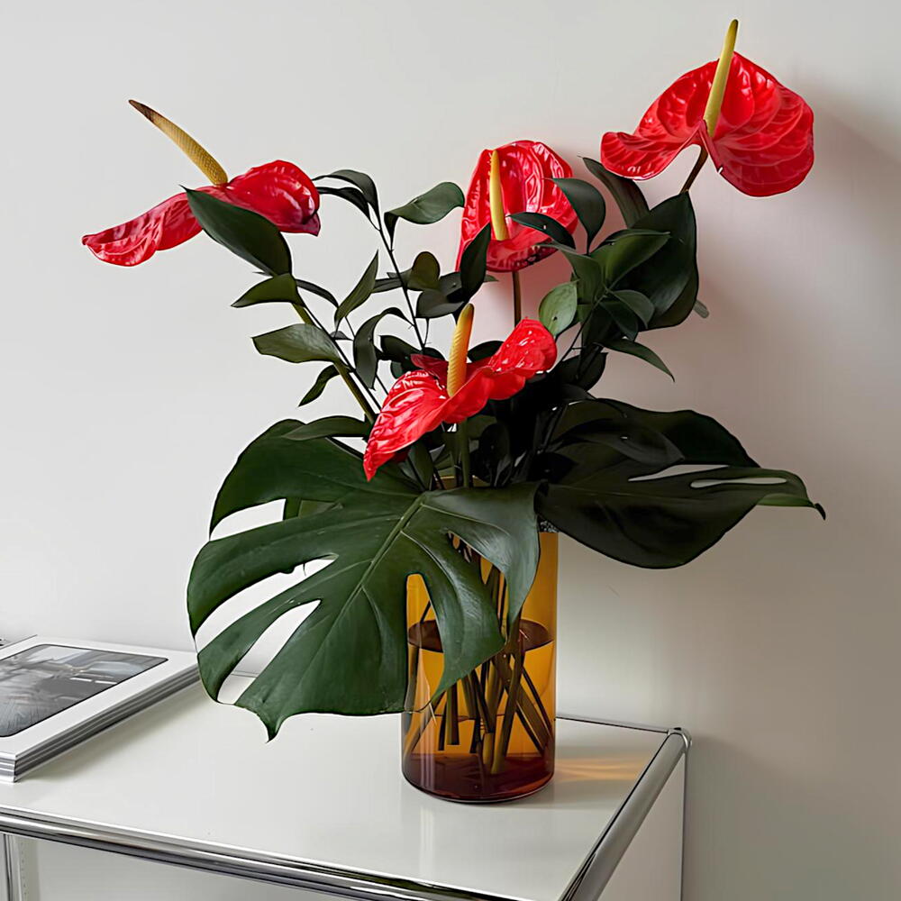 El ramo Fuego Tropical es un toque exótico y vibrante que aporta energía y dinamismo a cualquier espacio. Los intensos anturios rojos combinados con hojas de monstera y eucalipto crean una composición moderna e impactante. Ideal tanto para la decoración de oficinas como para adornar el hogar.