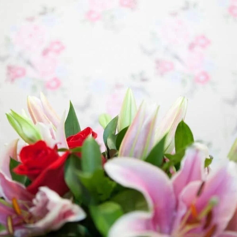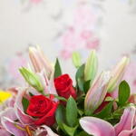 rosas rojas - 7 ud. lilium rosa - 7 ud. verdes de temporada - 9 ud.