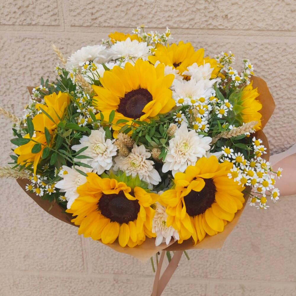 Este hermoso ramo iluminará cualquier día con su brillo natural y energía positiva. Los vibrantes girasoles son los protagonistas, combinados con delicadas margaritas y elegantes flores blancas que añaden frescura y suavidad. El envoltorio de papel kraft resalta el estilo rústico y encantador, evocando campos soleados y la naturaleza en su máxima expresión. Ideal para regalar en ocasiones especiales, como cumpleaños, agradecimientos o simplemente para expresar felicidad y cariño. Un arreglo que traerá luz y calidez al corazón de quien lo reciba.