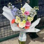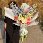 White rose - 5 ud. packaging - 6 ud. Gerbera rosa - 4 ud. matthiola - 5 ud. clavel naranja - 7 ud. delphinium - 5 ud. alimento para flores - 1 ud. clavel mini verde - 3 ud.