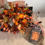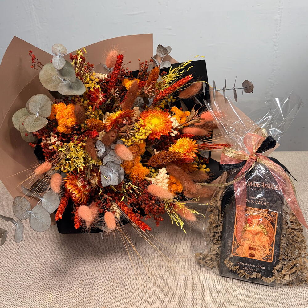 Realza tus regalos con una combinación cuidadosamente seleccionada, diseñada para quienes aprecian la belleza atemporal y los sabores sofisticados. Este set combina el encanto rústico de un ramo seco artesanal con la herencia de uno de los chocolateros más prestigiosos de Europa. El Ramo Este arreglo es una obra maestra de texturas. Con eucalipto preservado, suaves colas de conejo y vibrantes flores de paja, captura la calidez de un atardecer dorado. A diferencia de las flores frescas, este ramo se conserva hermoso durante meses, convirtiéndose en una impresionante pieza de decoración para el hogar mucho después de su llegada. El Chocolate Déjate consentir con Chocolate Amatller 70% Cacao, un legendario capricho español desde 1797. Envuelto en su icónico empaque Art Nouveau, este chocolate negro ofrece un perfil de sabor suave e intenso con notas tostadas que combinan a la perfección con los tonos terrosos del arreglo floral. ¿Por qué elegir este set? • Larga duración: Las flores no requieren agua y se mantienen vibrantes indefinidamente. • Calidad Gourmet: Incluye chocolate artesanal de renombre mundial. • Listo para regalar: Envuelto profesionalmente en papel premium con cintas de satén de lujo. • Versátil: Perfecto para cumpleaños, aniversarios o una elegante forma de agradecimiento.