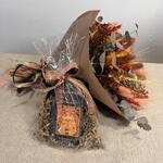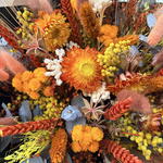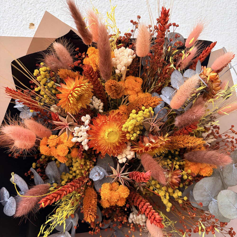 Eucalyptus - 5 ud. lagurus (dried flowers) - 25 ud. helichrysum - 5 ud. nigella - 6 ud. mimosa - 7 ud. trigo seco - 10 ud. palaris - 5 ud. craspedia - 6 ud. amatlier barra de chocolate 70% cacao - 1 ud.
