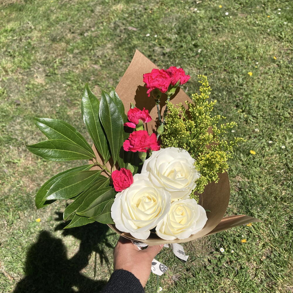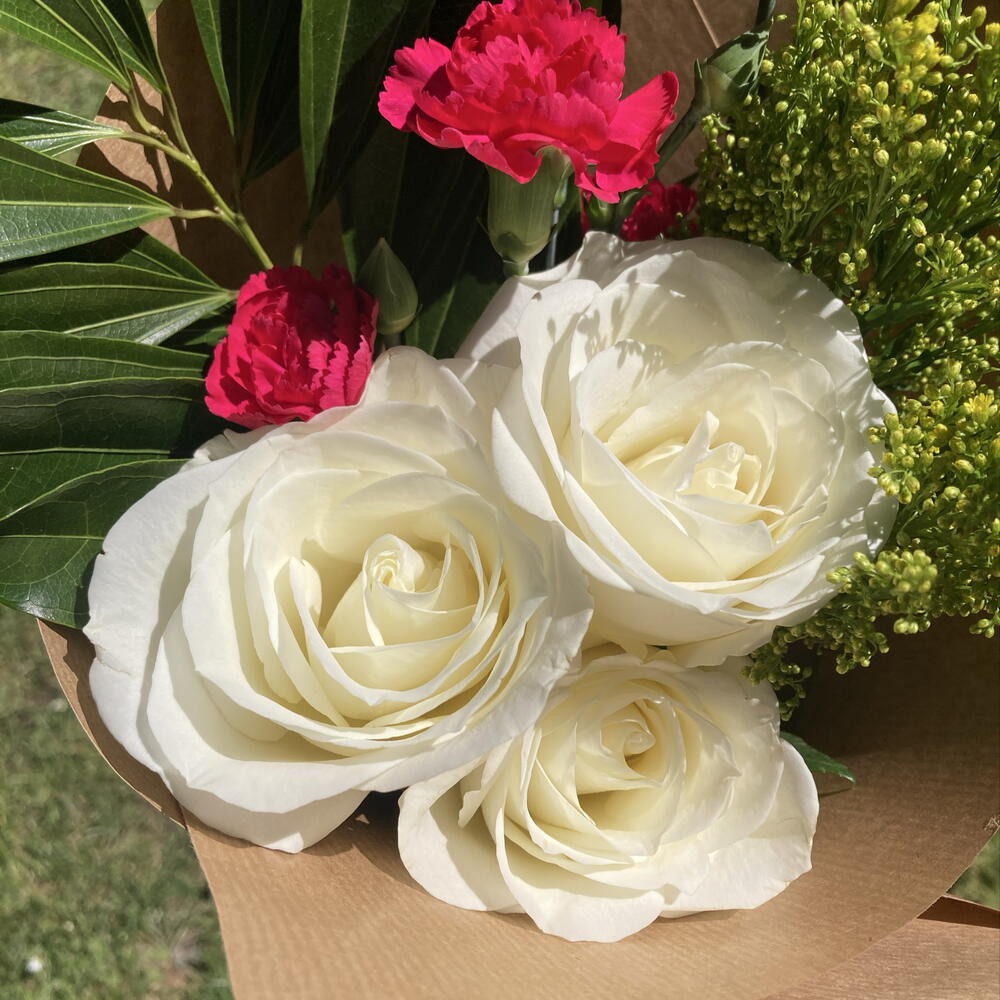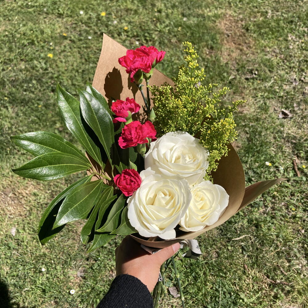 Solidago - 1 ud. rosas blancas - 3 ud. coculus - 1 ud. mini clavel - 2 ud.