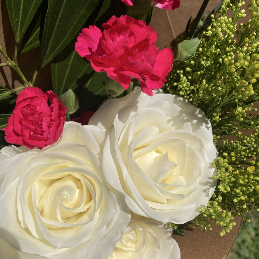 Linda composición con buenas vibraciones! Compuesto por tres rosas Tíbet blanca y acentos de colore fucsia con mini claveles.