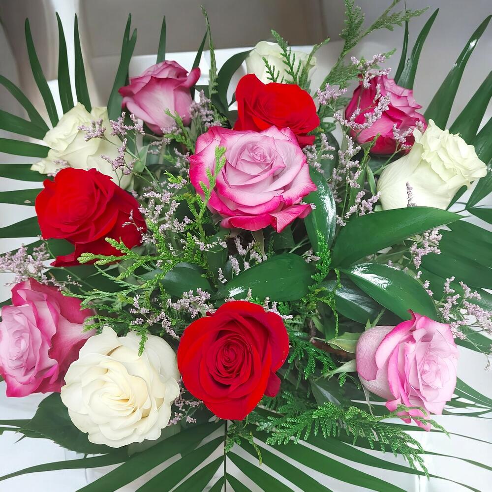 Precioso ramo de rosas de colores variados, mezcla de colores delicada.