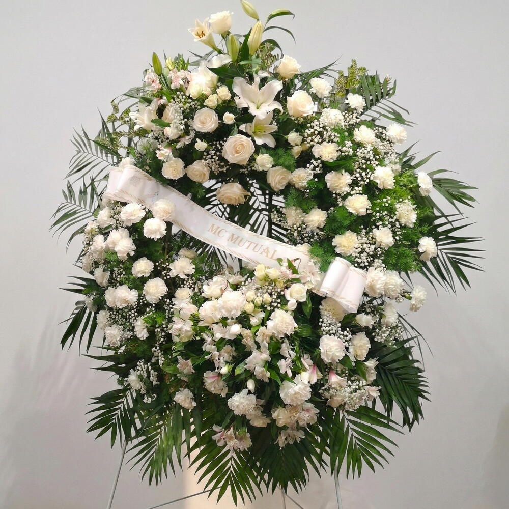 Una elegante corona funeraria en tonos blancos que transmite paz, respeto y recuerdo eterno. Su composición armoniosa combina flores delicadas y frescas, creando una imagen serena y solemne. Los lirios blancos simbolizan pureza y alma en descanso, mientras que las rosas expresan amor y despedida sincera. Los claveles y las pequeñas flores aportan volumen y suavidad, acompañados de un verde natural que enmarca la pieza con dignidad. Es una opción ideal para ceremonias de despedida, homenajes y momentos de recuerdo. Esta corona transmite apoyo, consuelo y respeto en los momentos más sensibles. Para su conservación, mantener en un lugar fresco, evitar la exposición directa al sol y humedecer ligeramente la base floral para prolongar su frescura.