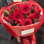 skimmia - 2 ud. tulipanes - 10 ud. rosa sp. frambuesa - 1 ud.