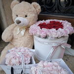 Box - 1 ud. ranunculus hanoi - 50 ud. roses - 65 ud. teddy 1m - 1 ud. premium bag - 2 ud.