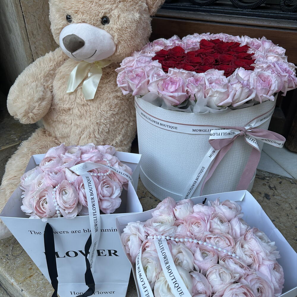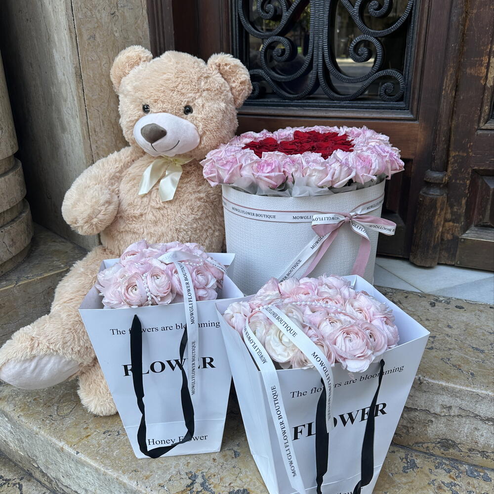 Box - 1 ud. ranunculus hanoi - 50 ud. roses - 65 ud. teddy 1m - 1 ud. premium bag - 2 ud.
