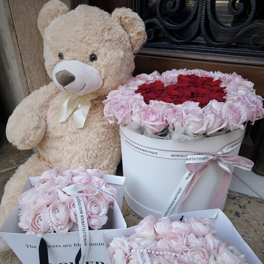 Para los que quieren dejar una huella imborrable nuestro ser más exclusivo con caja de rosas XL, 2 bolsas premium repletas de ranunculus Hanoi y un oso de peluche de 1m.