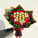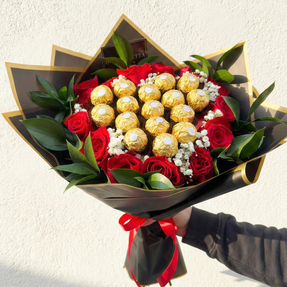 Un elegante y sofisticado ramo compuesto por 16 bombones Ferrero Rocher dispuestos con rosas rojas frescas, gypsophila blanca y follaje verde intenso. Todo envuelto en papel negro con bordes dorados, realzado con un lazo rojo satinado. Ideal para conquistar corazones, celebrar aniversarios o sorprender con un detalle que mezcla flores y chocolate de forma única.