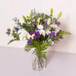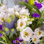 Eringium - 2 ud. lilium blanco - 2 ud. estatice morado - 1 ud. margaritas blanca - 6 ud.