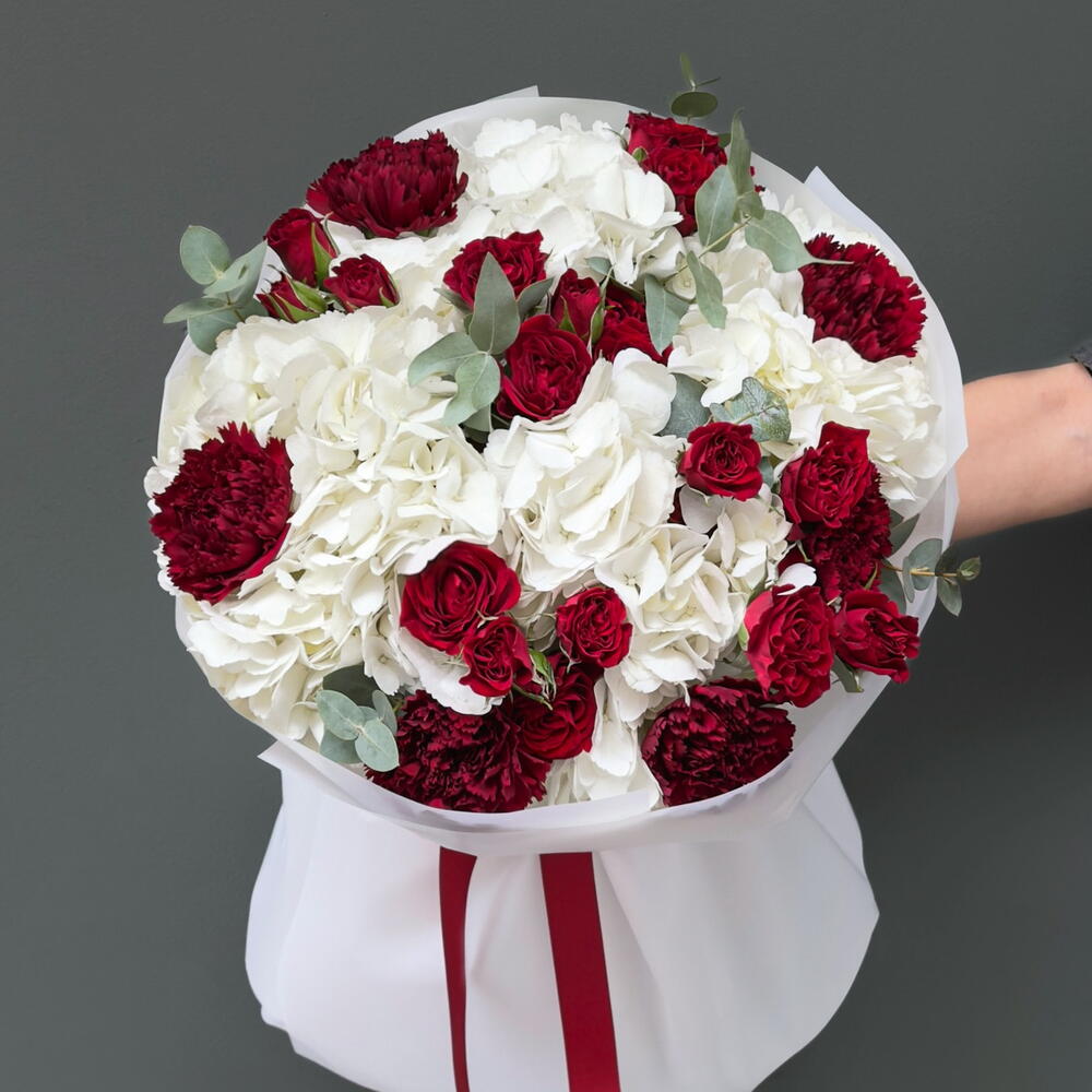 Eucalyptus - 5 ud. hortensia - 4 ud. clavel - 6 ud. rosa spray - 5 ud.