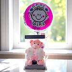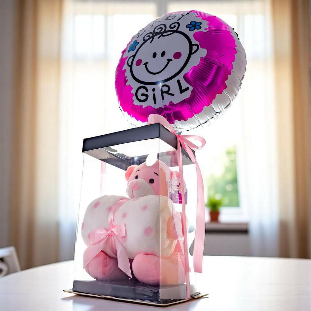 Un tierno y delicado detalle para celebrar la llegada de una hermosa bebé. Este set incluye un osito de peluche rosa suave, envuelto con una mantita de felpa con moño de satén, todo dentro de una elegante caja con tapa. Acompañado de un globo metálico con el mensaje “Baby Girl”, ¡es el regalo perfecto para dar la bienvenida con amor y ternura!