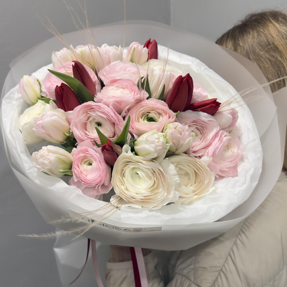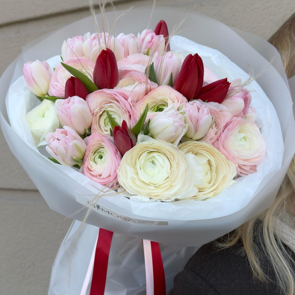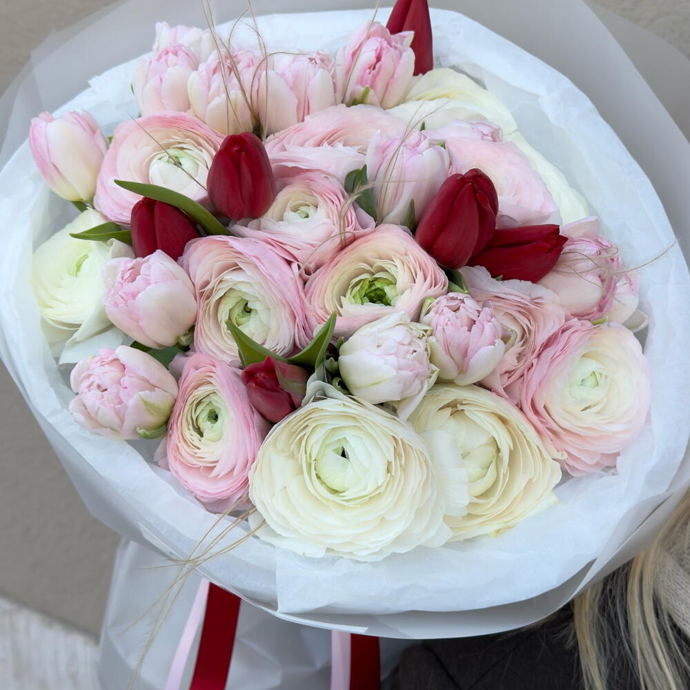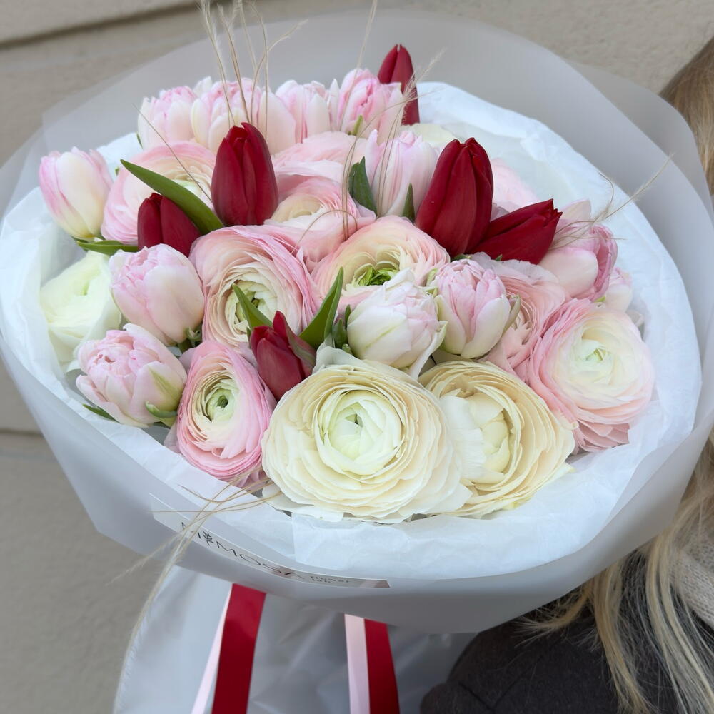 packaging design - 2 ud. ranunculus hanoi - 15 ud. ribbon satin - 2 ud. tulipanes dobles - 13 ud. tulipán rojo holanda - 3 ud.