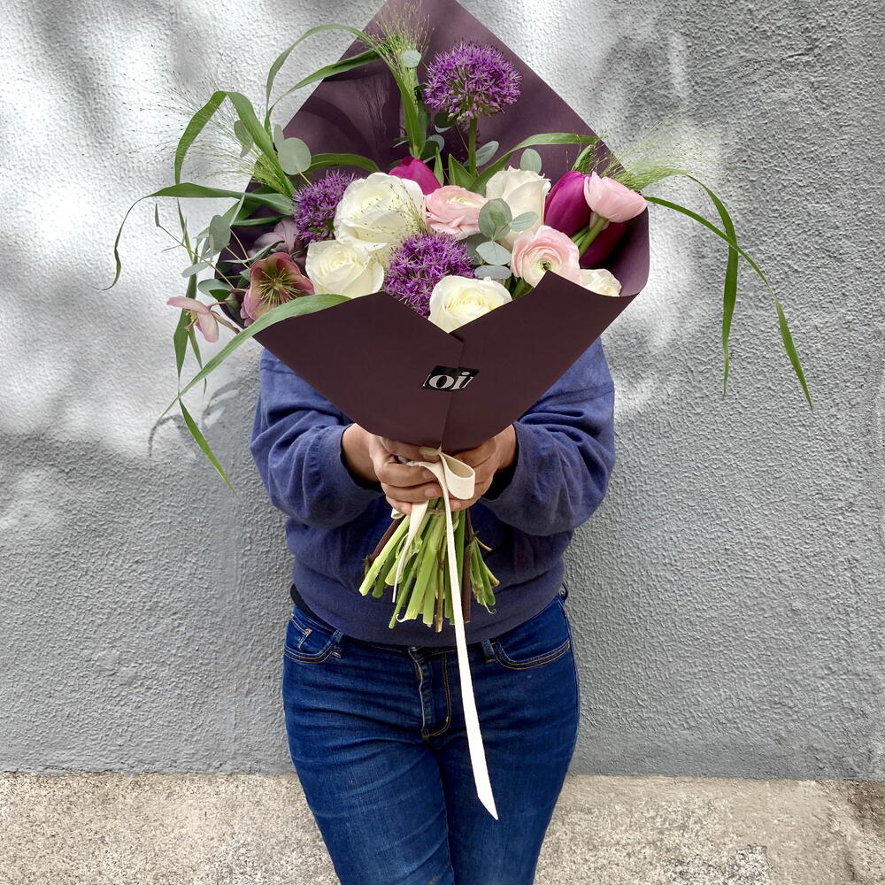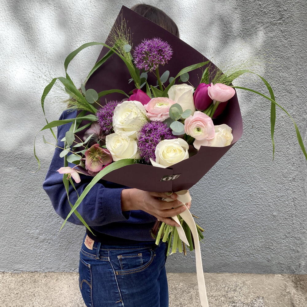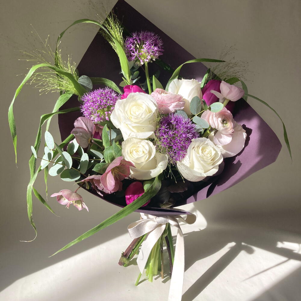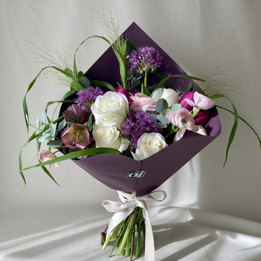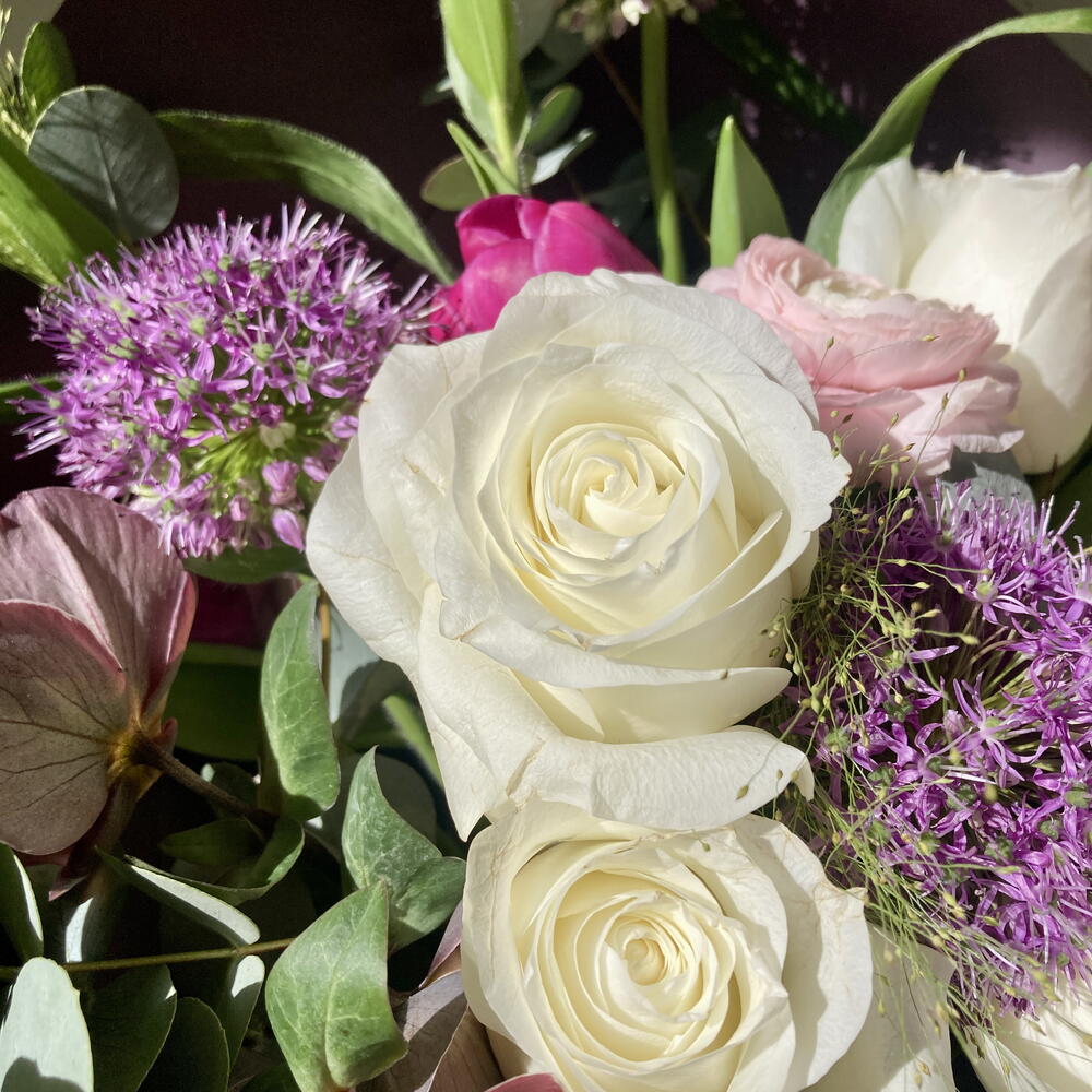 tulipanes - 6 ud. eucalipto - 3 ud. allium - 3 ud. rosas blancas - 5 ud. helleborus - 3 ud. ranunculos rosa - 5 ud. siergras - 4 ud.