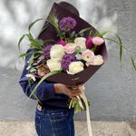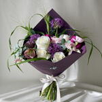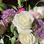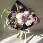 Precioso diseño edición especial para el día de la madre, combina rosas blancas clásicas con una variedad de flores silvestres en tonos violetas.