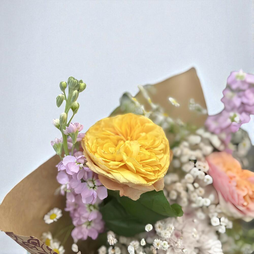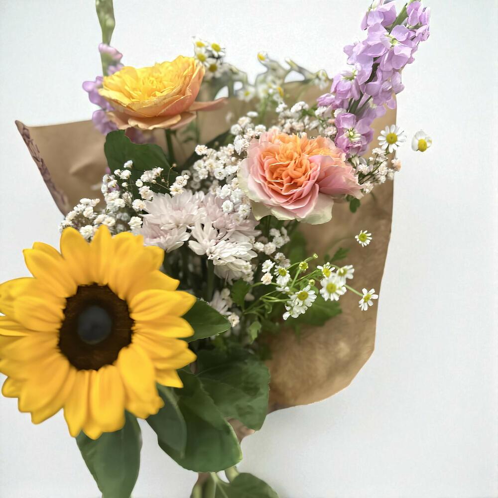 rosa de jardín - 2 ud. manzanilla - 1 ud. girasol grande - 1 ud. antirrium - 2 ud. paniculata y limonium - 2 ud.