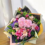 Un bouquet que parece sacado de un sueño, lleno de vida, colores vibrantes y texturas únicas. Las hortensias rosadas y lilas se mezclan con rosas elegantes y crisantemos delicados, mientras que pequeños detalles florales como waxflowers y hojas verdes frescas aportan dinamismo y frescura. Su diseño armonioso y sofisticado lo hace perfecto para celebrar momentos especiales, decorar eventos o como un regalo inolvidable. El envoltorio moderno en tonos dorados y pastel resalta aún más la belleza de cada flor, convirtiéndolo en un verdadero espectáculo visual.