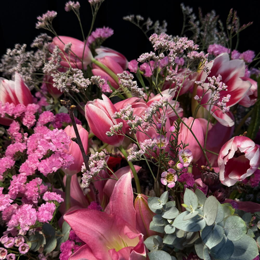 Limonium - 5 ud. lirio - 3 ud. eucalipto - 1 ud. rosa - 5 ud. clavel - 5 ud. rosa roja - 1 ud.