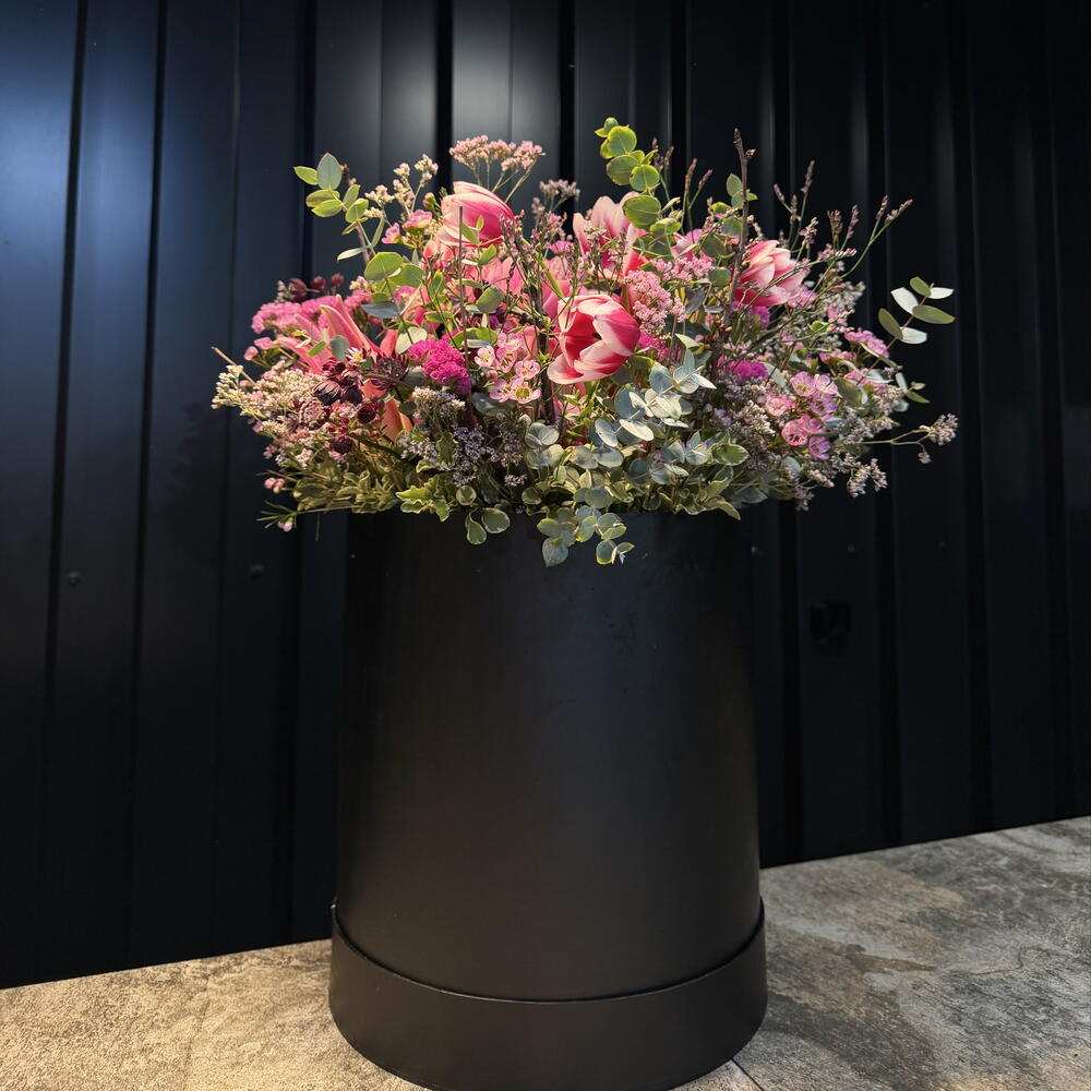 Caja floral con rosas rojas seleccionadas, símbolo de pasión y carácter. Una composición intensa y refinada, presentada con equilibrio y sofisticación.